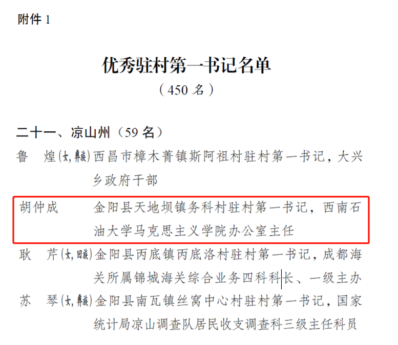近日,四川省委組織部聯(lián)合省委農(nóng)辦、省直機關(guān)工委、省農(nóng)業(yè)農(nóng)村廳和省鄉(xiāng)村振興局發(fā)布《關(guān)于通報表揚全省優(yōu)秀駐村第一書記和工作隊員的通知》,中共涼山州委組織部等聯(lián)合發(fā)布表彰文件,我校派駐涼山州金陽縣天地壩鎮(zhèn)務(wù)科村第一書記胡仲成獲評四川省優(yōu)秀駐村第一書記,駐村工作隊員張旭東獲評涼山州鄉(xiāng)村振興優(yōu)秀駐村工作隊員。