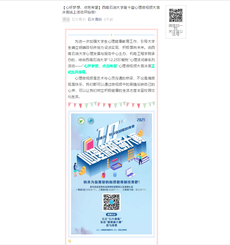 11月4日下午,“心懷夢想,點亮希望”第十屆心理微視頻大賽決賽于線上線下同步舉行,線上微視頻突破20000余人次觀看。此次活動由西南石油大學心理發展與服務中心主辦,機電工程學院心理服務站承辦,旨在加強和改進大學生進行心理健康教育工作,引導大學生確立明確目標并努力設法實現、積極面向未來。