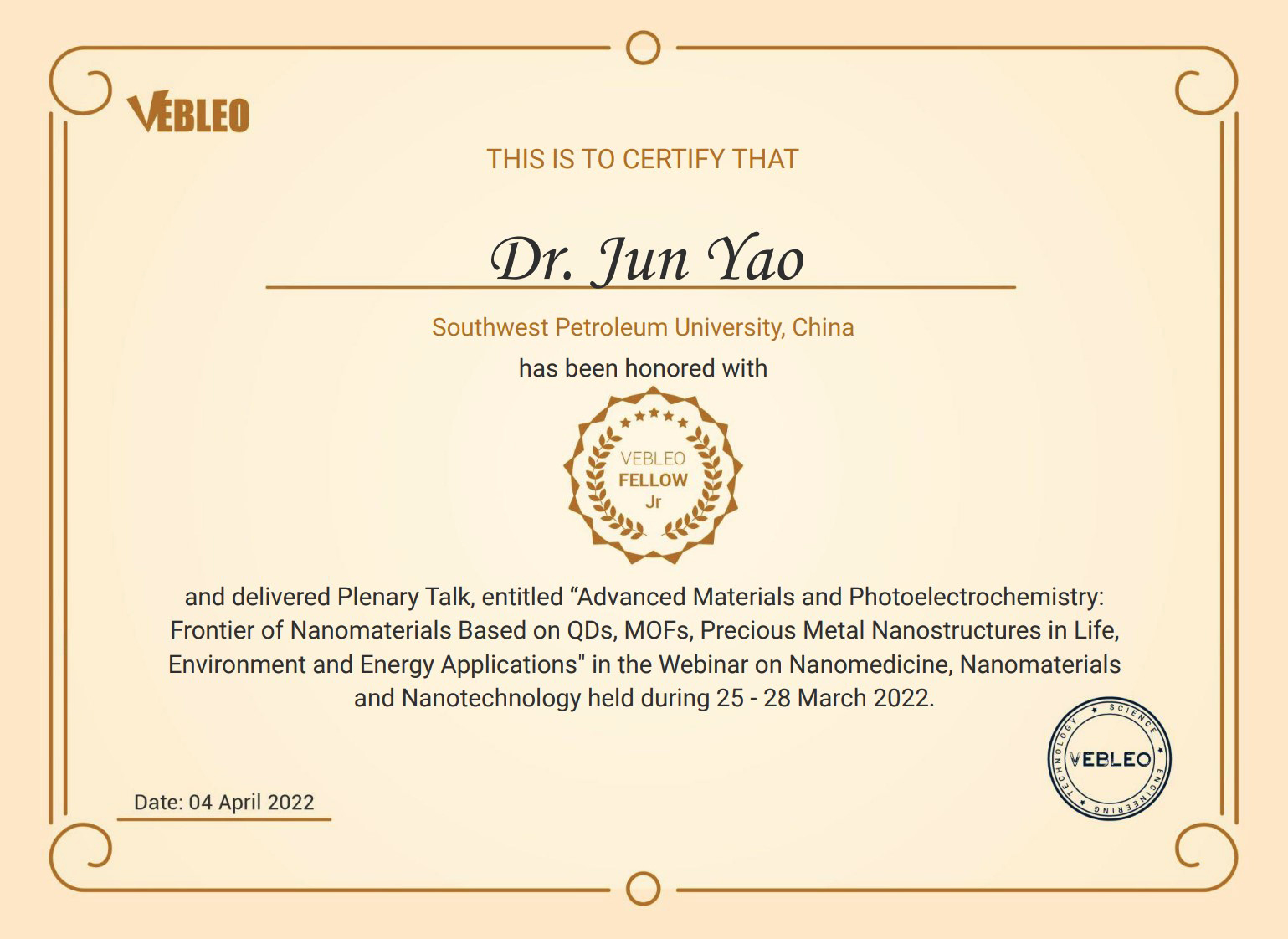 近日,我校化工院姚軍副教授被授予國(guó)際科學(xué)組織Vebleo協(xié)會(huì)會(huì)士(Vebleo Fellow),并在Vebleo主辦的納米醫(yī)學(xué)、納米材料網(wǎng)絡(luò)研討會(huì)(Webinar on Nanomedicine,Nanomaterials and Nanotechnology)中作了題為“Advanced Materials and Photoelectrochemistry:Frontier of Nanomaterials Based on QDs,MOFs,Precious Metal Nanostructures in Life, Environment and Energy Applications”的大會(huì)報(bào)告(Plenary Talk)。