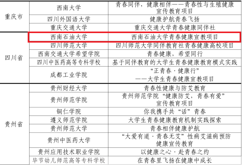 近日,中國(guó)計(jì)生協(xié)公布了2023年青春健康高校項(xiàng)目中標(biāo)結(jié)果,由我校校醫(yī)院指導(dǎo)學(xué)生社團(tuán)申報(bào)的項(xiàng)目《西南石油大學(xué)青春健康宣教項(xiàng)目》中標(biāo)。本次申報(bào)中四川省共5所高校中標(biāo)。