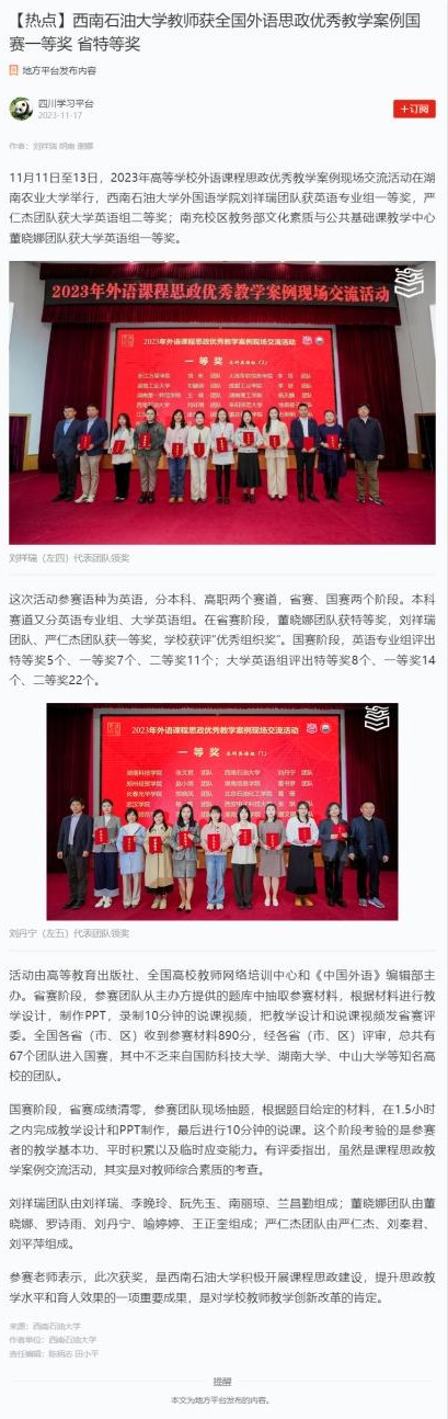 11月11日至13日,2023年高等學校外語課程思政優秀教學案例現場交流活動在湖南農業大學舉行,西南石油大學外國語學院劉祥瑞團隊獲英語專業組一等獎,嚴仁杰團隊獲大學英語組二等獎;南充校區教務部文化素質與公共基礎課教學中心董曉娜團隊獲大學英語組一等獎。