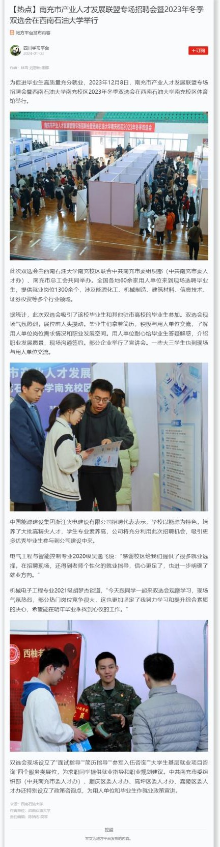 為促進畢業生高質量充分就業,2023年12月8日,南充市產業人才發展聯盟專場招聘會暨西南石油大學南充校區2023年冬季雙選會在西南石油大學南充校區體育館舉行。
