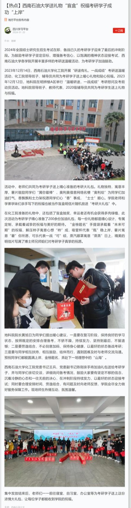 2023年12月14日,西南石油大學化工院開展“研途有禮,一戰成碩”考研送溫暖活動,化工院領導班子、輔導員共同為考研學子送上暖心禮物和貼心祝福。2023年12月12日,地科院在明辨樓A區舉行“溫暖研途,一戰成碩”考研慰問及考前動員活動。地科院領導班子、教師代表、2020級輔導員共同為考研學生送上禮物與祝福。