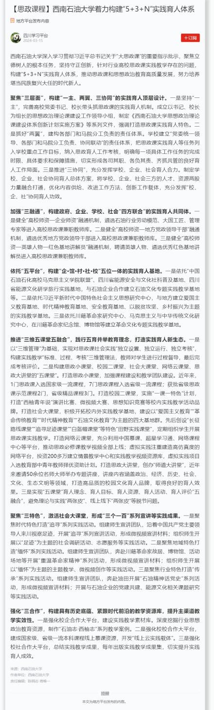 西南石油大學深入學習貫徹習近平總書記關于“大思政課”的重要指示批示,聚焦立德樹人的根本任務,堅持守正創(chuàng)新,針對行業(yè)高校思政課實踐教學存在的問題,構建“5+3+N”實踐育人體系,推動思政課和思想政治教育高質量發(fā)展,努力培養(yǎng)堪當民族復興重任的時代新人。
