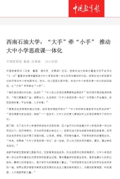 中國教育報(bào)訊(記者 魯磊 通訊員 皮璟璇)近日,西南石油大學(xué)舉辦重溫習(xí)近平總書記“3·18”重要講話精神暨推進(jìn)大中小學(xué)思政課一體化共同體建設(shè)研討會(huì)。西南石油大學(xué)黨委書記張烈輝與中小學(xué)黨委書記、校長,幼兒園園長面對面,共話大中小學(xué)思政課一體化的實(shí)現(xiàn)路徑,讓“大手”牢牢牽住“小手”。
