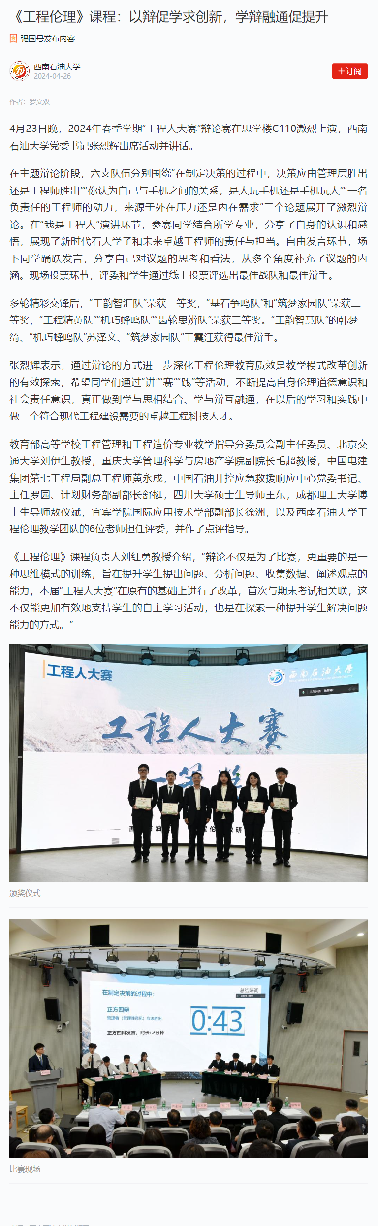 教育部高等學校工程管理和工程造價專業教學指導分委員會副主任委員、北京交通大學劉伊生教授,重慶大學管理科學與房地產學院副院長毛超教授,中國電建集團第七工程局副總工程師黃永成,中國石油井控應急救援響應中心黨委書記、主任羅園、計劃財務部副部長舒挺,四川大學碩士生導師王東,成都理工大學博士生導師敖儀斌,宜賓學院國際應用技術學部副部長徐洲,以及西南石油大學工程倫理教學團隊的6位老師擔任評委,并作了點評指導。