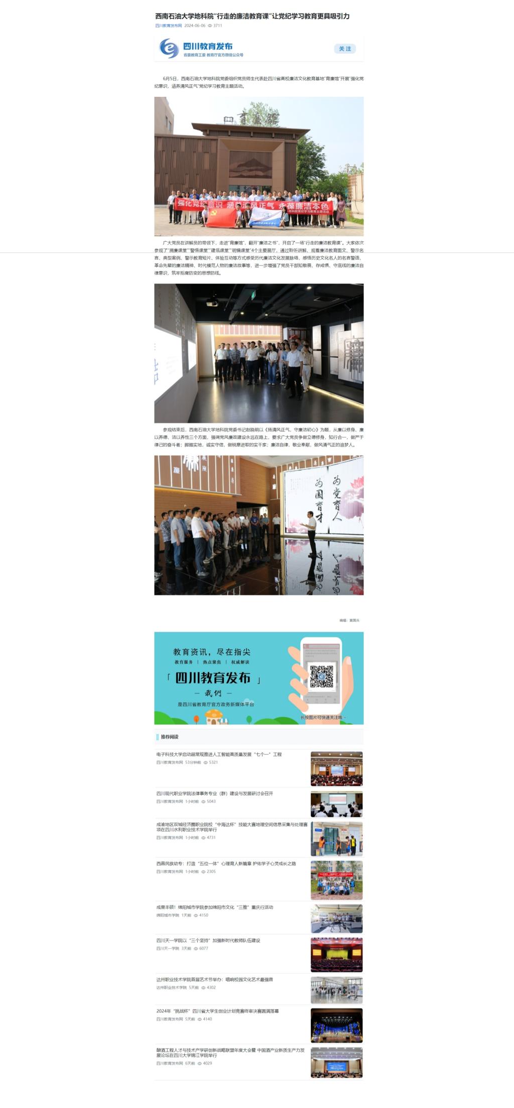 6月5日,西南石油大學地科院黨委組織黨員師生代表赴四川省高校廉潔文化教育基地“育廉館”開展“強化黨紀意識,涵養(yǎng)清風正氣”黨紀學習教育主題活動。