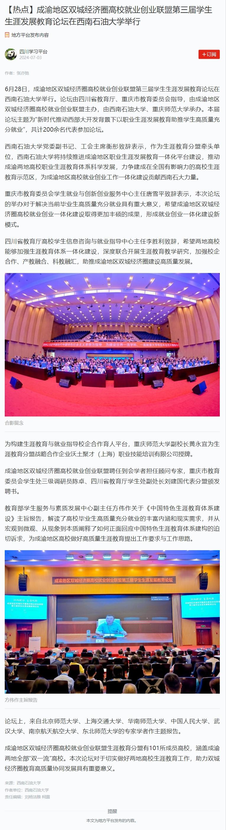 6月28日,成渝地區雙城經濟圈高校就業創業聯盟第三屆學生生涯發展教育論壇在西南石油大學舉行。論壇由四川省教育廳、重慶市教育委員會指導,由成渝地區雙城經濟圈高校就業創業聯盟主辦,由西南石油大學、重慶師范大學承辦。本屆論壇主題為“新時代推動西部大開發背景下以職業生涯發展教育助推學生高質量充分就業”,共計200余名代表參加論壇。