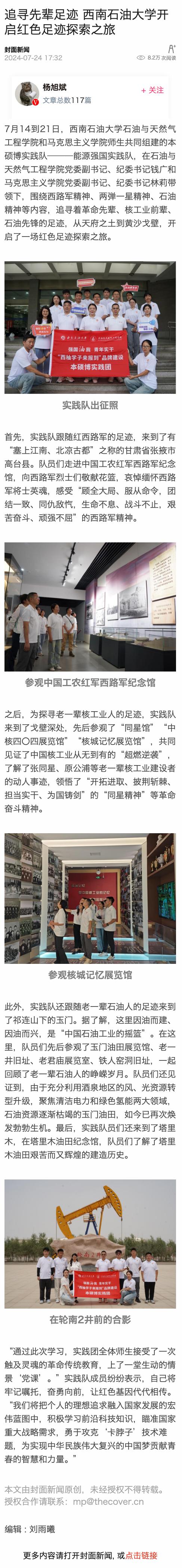 西南石油大學認真學習貫徹習近平總書記關于學校思政課建設的重要指示精神,依托優勢學科平臺,圍繞能源強國等重點領域,組織石油與天然氣工程學院和馬克思主義學院師生成立本碩博社會實踐隊——能源強國實踐隊,師生先后走進中國工農紅軍西路軍紀念館、中國核工業集團有限公司、玉門油田、塔里木油田,追溯紅色記憶、訪談紅色人物、挖掘紅色故事、體悟紅色文化。