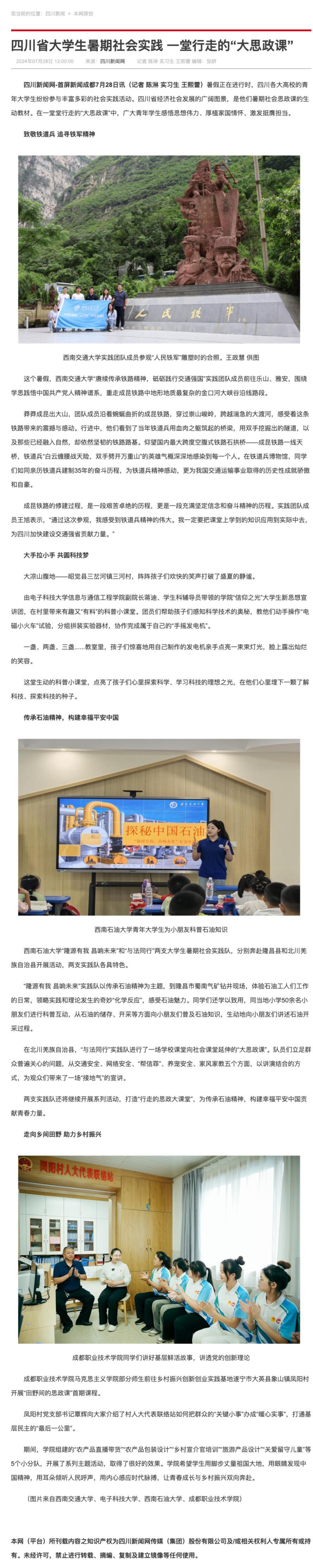 四川新聞網(wǎng)-首屏新聞成都7月28日訊(記者 陳淋 實(shí)習(xí)生 王熙蕾)暑假正在進(jìn)行時(shí),四川各大高校的青年大學(xué)生紛紛參與豐富多彩的社會(huì)實(shí)踐活動(dòng)。四川省經(jīng)濟(jì)社會(huì)發(fā)展的廣闊圖景,是他們暑期社會(huì)思政課的生動(dòng)教材。在一堂堂行走的“大思政課”中,廣大青年學(xué)生感悟思想偉力、厚植家國(guó)情懷、激發(fā)挺膺擔(dān)當(dāng)。