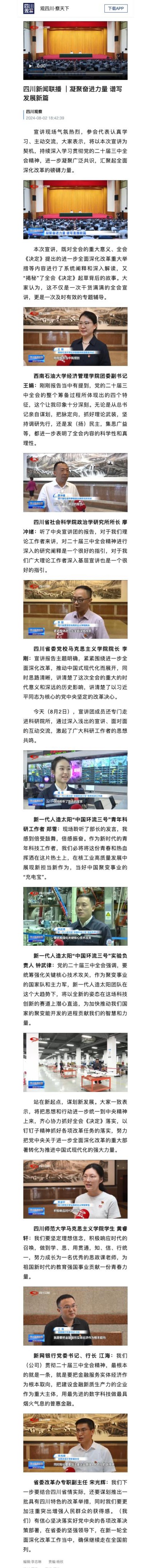 省委改革辦專職副主任 宋光輝:我們下一步要結合四川省情實際,還要謀劃推出一批具有四川特色的改革舉措,同時我們要更加注重突出增強人民群眾的獲得感。(我們)有信心堅決落實好黨中央的各項改革決策部署,在省委的堅強領導下,在新一輪全面深化改革工作當中,確保繼續(xù)走在全國前列。