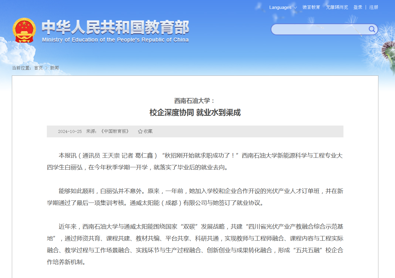 白麗弘所說的“訂單班”,是西南石油大學與通威太陽能圍繞國家“雙碳”發展戰略,在共建“四川省光伏產教融合綜合示范基地”的基礎上,聯合打造的人才培養特色模式。通過強化人才共培、師資共育、課程共建、教材共編、平臺共享、科研共通,實現教師與工程師融合、課程內容與工程實際融合、教學過程與工作場景融合、實踐環節與生產過程融合、創新創業與成果轉化融合,形成“五共五融”光伏產業人才校企合作培養新機制。