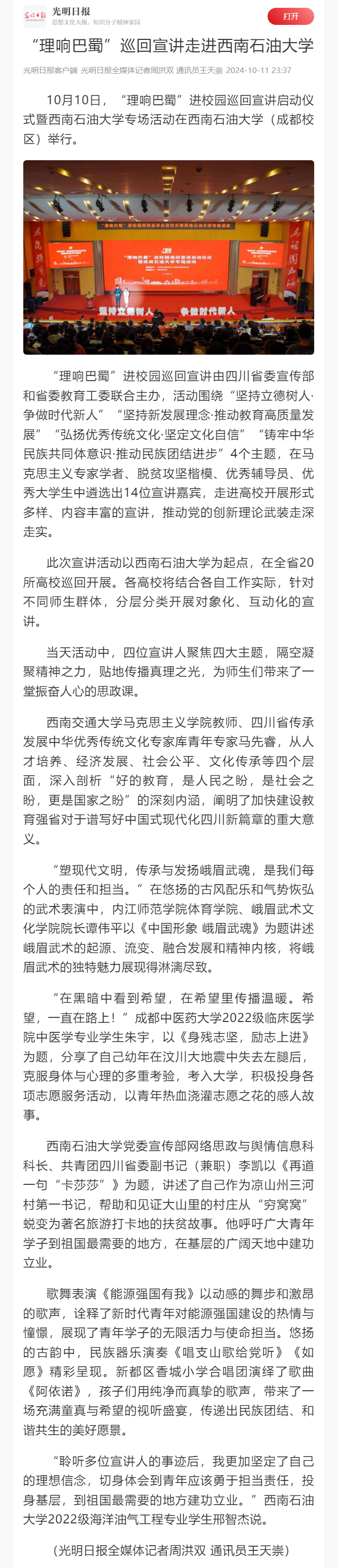 10月10日上午,“理響巴蜀”進校園巡回宣講啟動儀式暨西南石油大學(xué)專場活動在西南石油大學(xué)(成都校區(qū))舉行。
