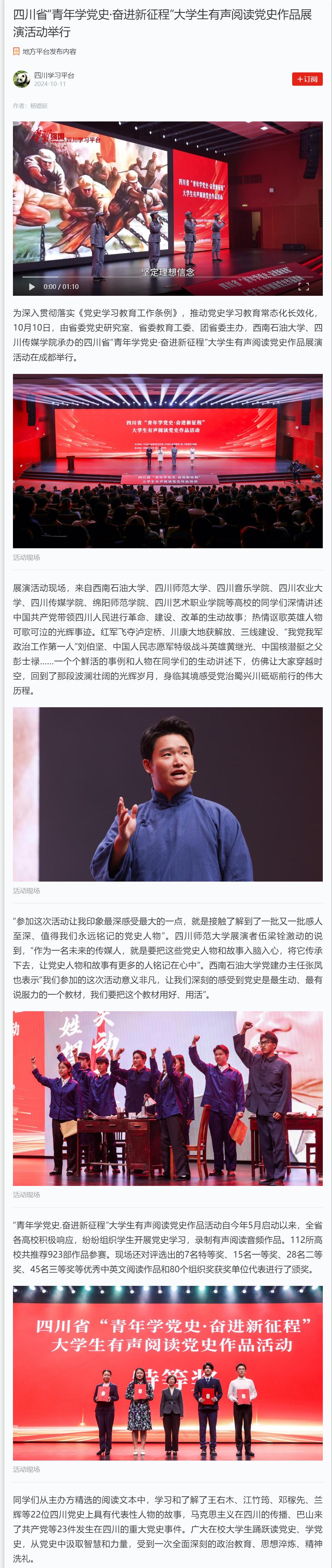 為深入貫徹落實《黨史學習教育工作條例》,推動黨史學習教育常態化長效化,10月10日,由省委黨史研究室、省委教育工委、團省委主辦,西南石油大學、四川傳媒學院承辦的四川省“青年學黨史·奮進新征程”大學生有聲閱讀黨史作品展演活動在成都舉行。