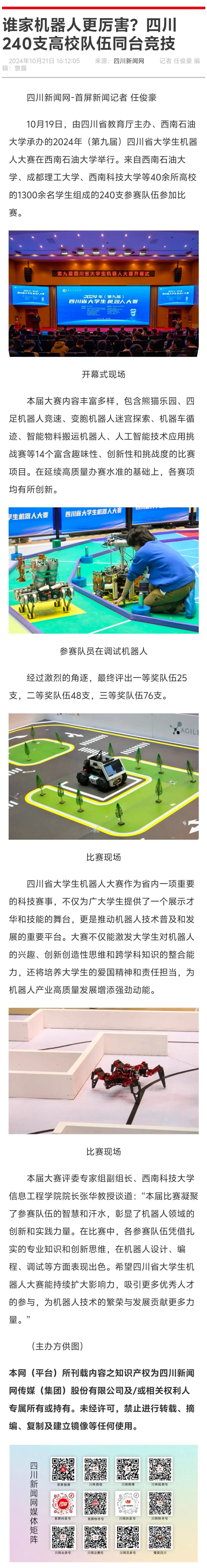 10月19日,由四川省教育廳主辦、西南石油大學(xué)承辦的2024年(第九屆)四川省大學(xué)生機器人大賽在西南石油大學(xué)舉行。來自西南石油大學(xué)、成都理工大學(xué)、西南科技大學(xué)等40余所高校的1300余名學(xué)生組成的240支參賽隊伍參加比賽。