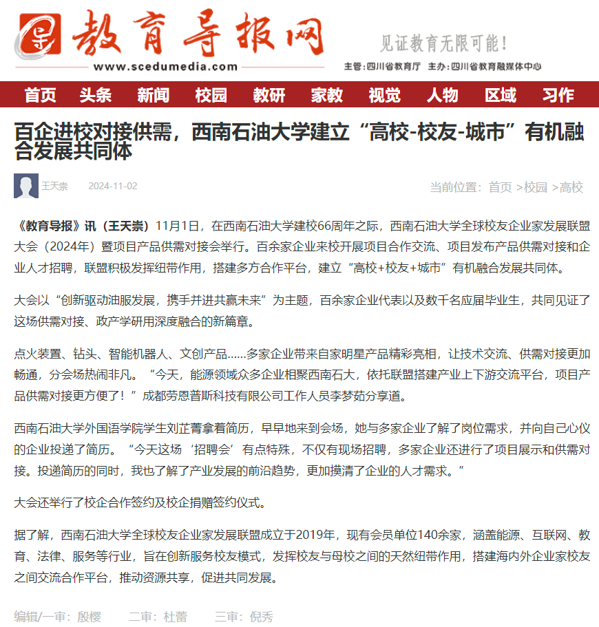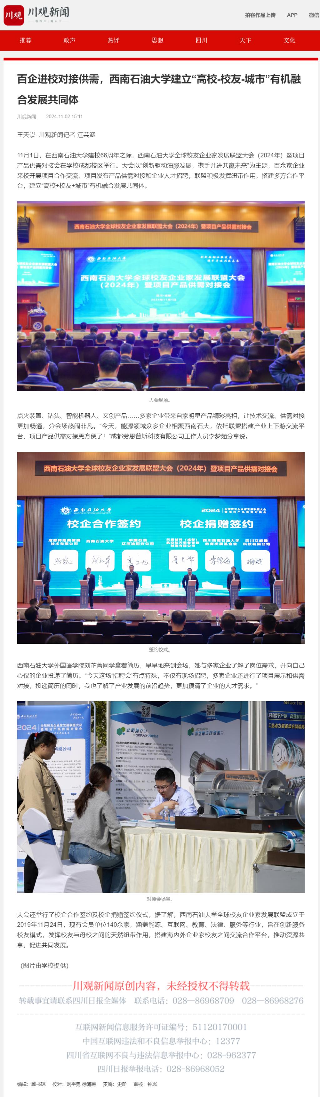 11月1日,在西南石油大學建校66周年之際,西南石油大學全球校友企業家發展聯盟大會(2024年)暨項目產品供需對接會在學校成都校區舉行。大會以“創新驅動油服發展,攜手并進共贏未來”為主題,百余家企業來校開展項目合作交流、項目發布產品供需對接和企業人才招聘,聯盟積極發揮紐帶作用,搭建多方合作平臺,建立“高校+校友+城市”有機融合發展共同體。