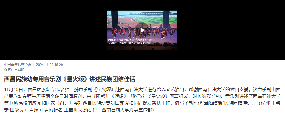 11月15日,西昌民族幼專80名師生攜音樂劇《星火頌》赴西南石油大學進行感恩文藝演出,感謝西南石油大學的對口支援。該音樂劇由西昌民族幼專師生歷經兩個多月時間原創,由《困惑》《旗幟》《騰飛》《星火頌》四幕組成,時長約76分鐘。音樂劇講述了西南石油大學等17所高校響應黨和國家號召,開展對西昌民族幼專對口支援和協同提質幫扶工作,譜寫了新時代“彝海結盟”民族團結佳話。(侯娜 王馨寧 田依靈 中青報·中青網記者 王鑫昕)