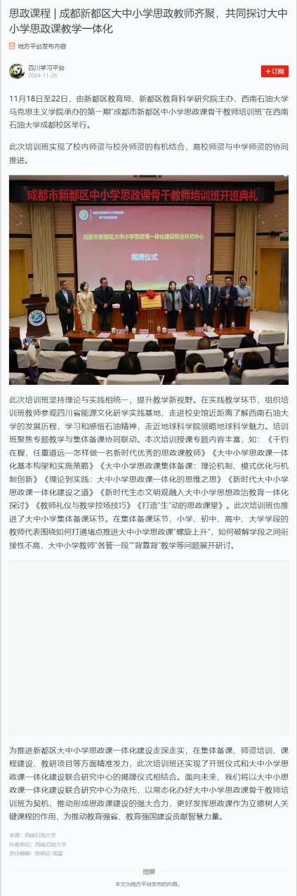11月18日至22日,由新都區(qū)教育局、新都區(qū)教育科學研究院主辦,西南石油大學馬克思主義學院承辦的第一期“成都市新都區(qū)中小學思政課骨干教師培訓班”在西南石油大學成都校區(qū)舉行。