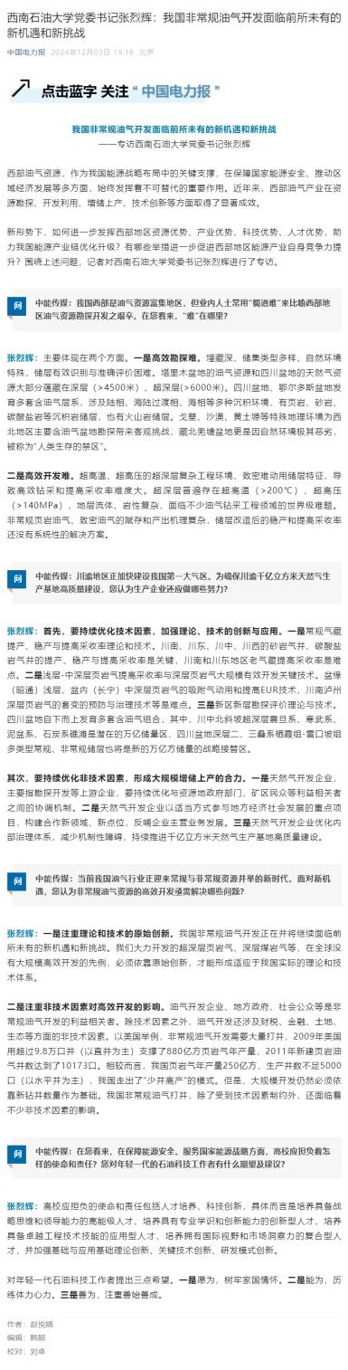 新形勢下,如何進一步發揮西部地區資源優勢、產業優勢、科技優勢、人才優勢,助力我國能源產業鏈優化升級?有哪些舉措進一步促進西部地區能源產業自身競爭力提升?圍繞上述問題,記者對西南石油大學黨委書記張烈輝進行了專訪。