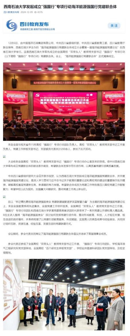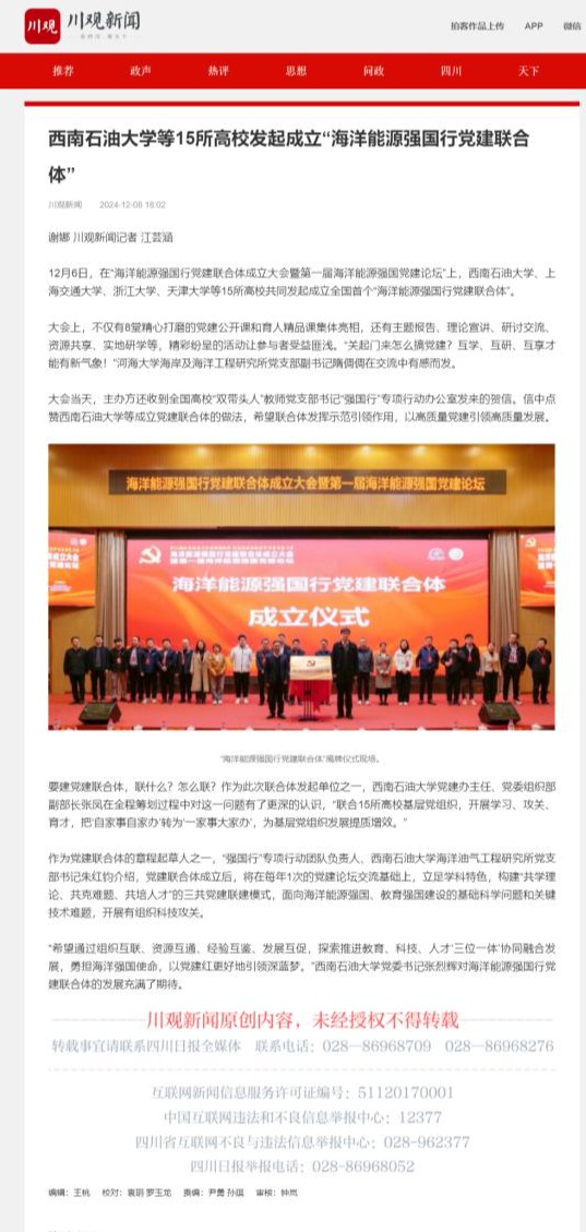 當天,西南石油大學、上海交通大學、浙江大學、天津大學等15所高校共同發起成立“海洋能源強國行黨建聯合體”。大會由中國海洋石油集團有限公司、四川省委組織部、四川省委教育工委、四川省教育廳聯合指導,西南石油大學主辦。主辦方介紹,這是全國范圍內率先成立的全國高?!半p帶頭人”教師黨支部書記“強國行”專項行動(簡稱“強國行”專項行動)黨建聯合體。