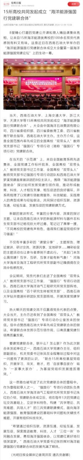 這一思路也被寫進了此次黨建聯合體的章程中。作為章程起草人之一,“強國行”專項行動團隊負責人、西南石油大學海洋油氣工程研究所黨支部書記朱紅鈞介紹,黨建聯合體成立后,將在每年1次的黨建論壇交流基礎上,立足學科特色,構建“共學理論、共克難題、共培人才”的三共黨建聯建模式,面向海洋能源強國、教育強國建設的基礎科學問題和關鍵技術難題,開展有組織科技攻關。