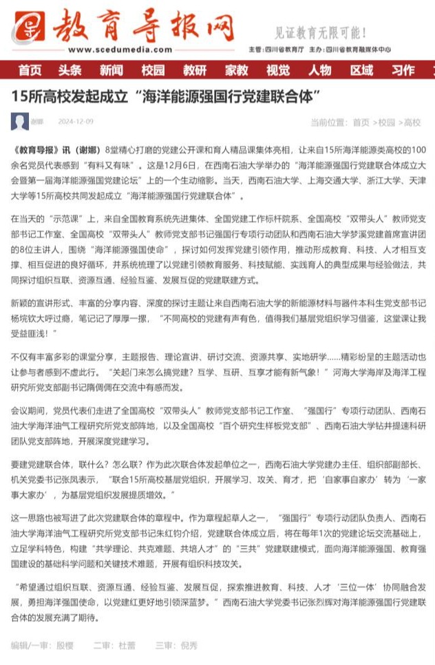 “希望通過組織互聯、資源互通、經驗互鑒、發展互促,探索推進教育、科技、人才‘三位一體’協同融合發展,勇擔海洋強國使命,以黨建紅更好地引領深藍夢。”西南石油大學黨委書記張烈輝對海洋能源強國行黨建聯合體的發展充滿了期待。
