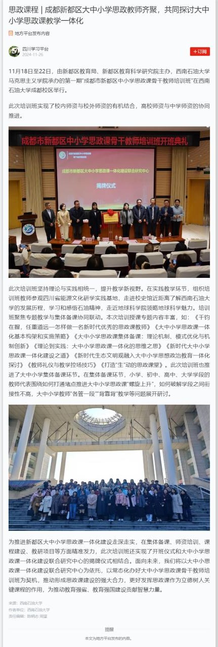 11月18日至22日,由新都區(qū)教育局、新都區(qū)教育科學研究院主辦,西南石油大學馬克思主義學院承辦的第一期“成都市新都區(qū)中小學思政課骨干教師培訓班”在西南石油大學成都校區(qū)舉行。