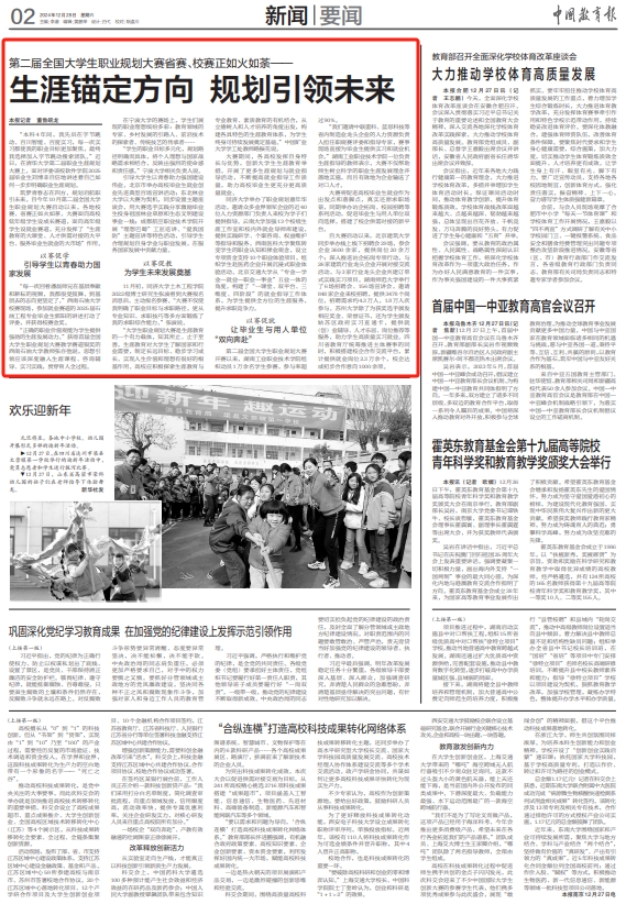 近日,中國教育報專題報道《第二屆全國大學生職業規劃大賽省賽、校賽正如火如荼——生涯錨定方向 規劃引領未來》中把我校作為“以賽促學 引導學生以青春助力國家發展”的典型,介紹了我校校賽金獎選手受我校校友、全國首屆基層就業卓越獎潘磊影響堅定基層就業的案例,并通過一線教師張亦弛展現了我校把思想引領融入生涯課程、咨詢輔導、實習實踐,貫穿育人全過程的生涯教育做法。