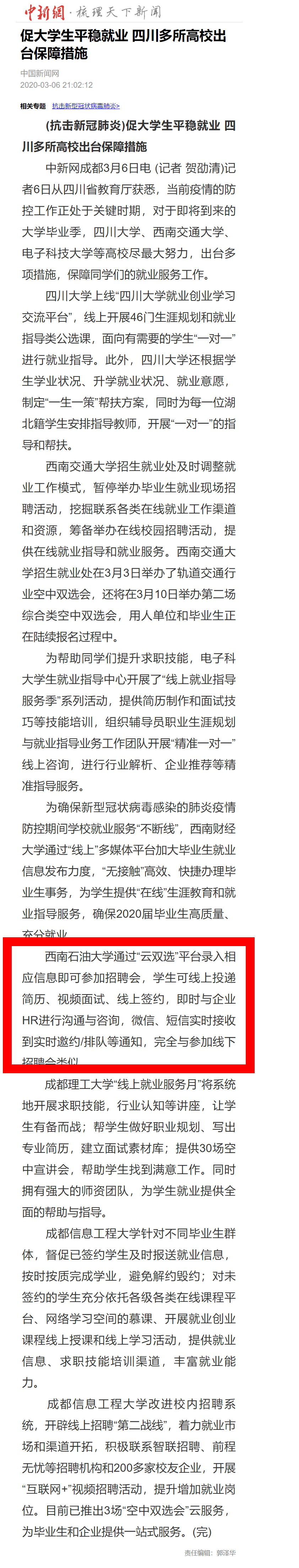 中新網(wǎng)成都3月6日電 (記者 賀劭清)記者6日從四川省教育廳獲悉,當前疫情的防控工作正處于關(guān)鍵時期,對于即將到來的大學畢業(yè)季,四川大學、西南交通大學、電子科技大學等高校盡最大努力,出臺多項措施,保障同學們的就業(yè)服務工作。