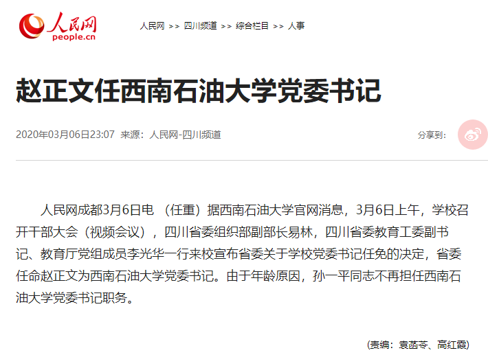 人民網成都3月6日電 (任重)據西南石油大學官網消息,3月6日上午,學校召開干部大會(視頻會議),四川省委組織部副部長易林,四川省委教育工委副書記、教育廳黨組成員李光華一行來校宣布省委關于學校黨委書記任免的決定,省委任命趙正文為西南石油大學黨委書記。由于年齡原因,孫一平同志不再擔任西南石油大學黨委書記職務。