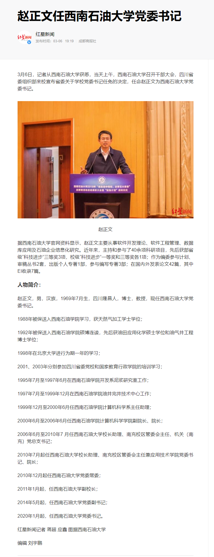 3月6日,記者從西南石油大學(xué)獲悉,當天上午,西南石油大學(xué)召開干部大會,四川省委組織部來校宣布省委關(guān)于學(xué)校黨委書記任免的決定,任命趙正文為西南石油大學(xué)黨委書記。