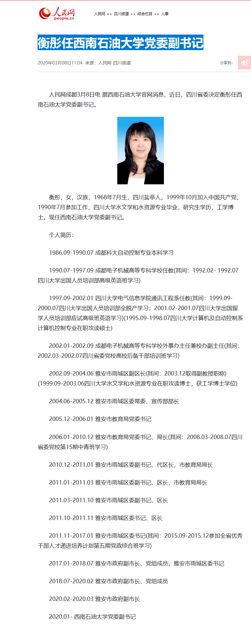 人民網(wǎng)成都3月8日電 據(jù)西南石油大學(xué)官網(wǎng)消息,近日,四川省委決定衡彤任西南石油大學(xué)黨委副書記。