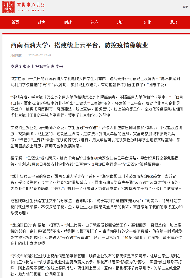 “疫情突發,學生就業怎么辦?用人單位招聘怎么辦?隔離病毒,不隔離用人單位和畢業學生。” 自2月4日起,西南石油大學招生就業處推出“云雙選”“云宣講”服務,搭建線上云平臺,幫助畢業生和企業足不出戶,就完成簡歷撰寫、簡歷篩選、線上宣講、視頻面試、線上簽約等工作,全力保障疫情防控期間畢業生就業工作的平穩有序進行,受到畢業生和企業的好評。