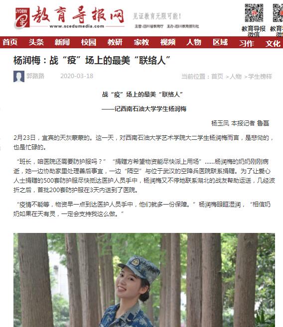 “能夠運用專業所學去傳播知識,奉獻愛心,在她身上我們看到了當代青年學生的自強和擔當。”說起預備黨員楊潤梅,西南石油大學藝術學院黨總支書記殷沖連連豎起大拇指。