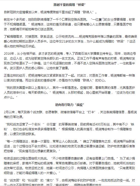 了解捐贈需求、對接醫院、聯系運送、公示物資流向……楊潤梅克服各種難以想象的困難,最終確保愛心物資如期抵達醫護人員手中。這位年僅21歲的女大學生,為什么能成為捐贈的“橋梁”?這還得從她的特殊經歷講起。