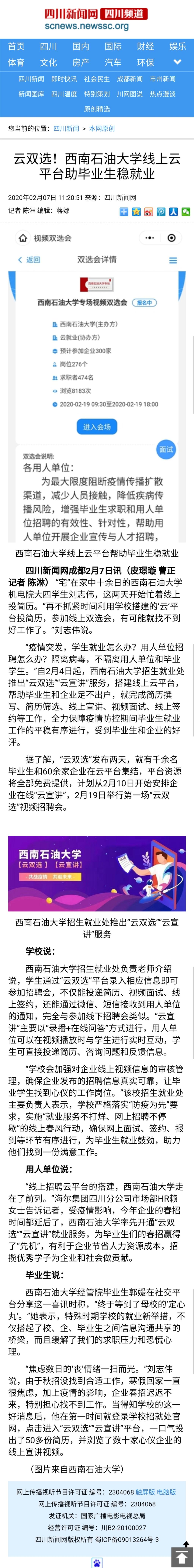 “疫情突發,學生就業怎么辦?用人單位招聘怎么辦?隔離病毒,不隔離用人單位和畢業學生。”自2月4日起,西南石油大學招生就業處推出“云雙選”“云宣講”服務,搭建線上云平臺,幫助畢業生和企業足不出戶,就完成簡歷撰寫、簡歷篩選、線上宣講、視頻面試、線上簽約等工作,全力保障疫情防控期間畢業生就業工作的平穩有序進行,受到畢業生和企業的好評。