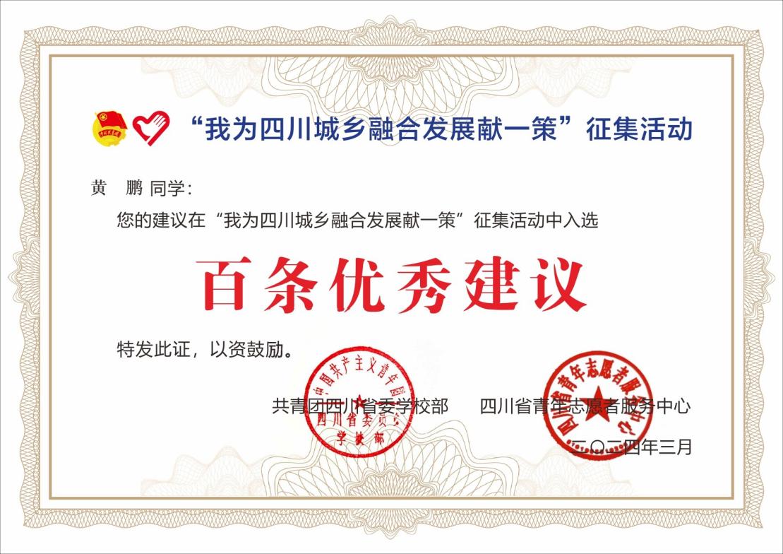 近日,團省委2024年“我為四川城鄉融合發展獻一策”征集活動“百條優秀建議”評選結果揭曉。法學院2021級法學專業黃鵬同學、2023級法學專業黃鴻霖、地質學專業2021級楊川榆同學提出的建議成功入選“百條優秀建議”。