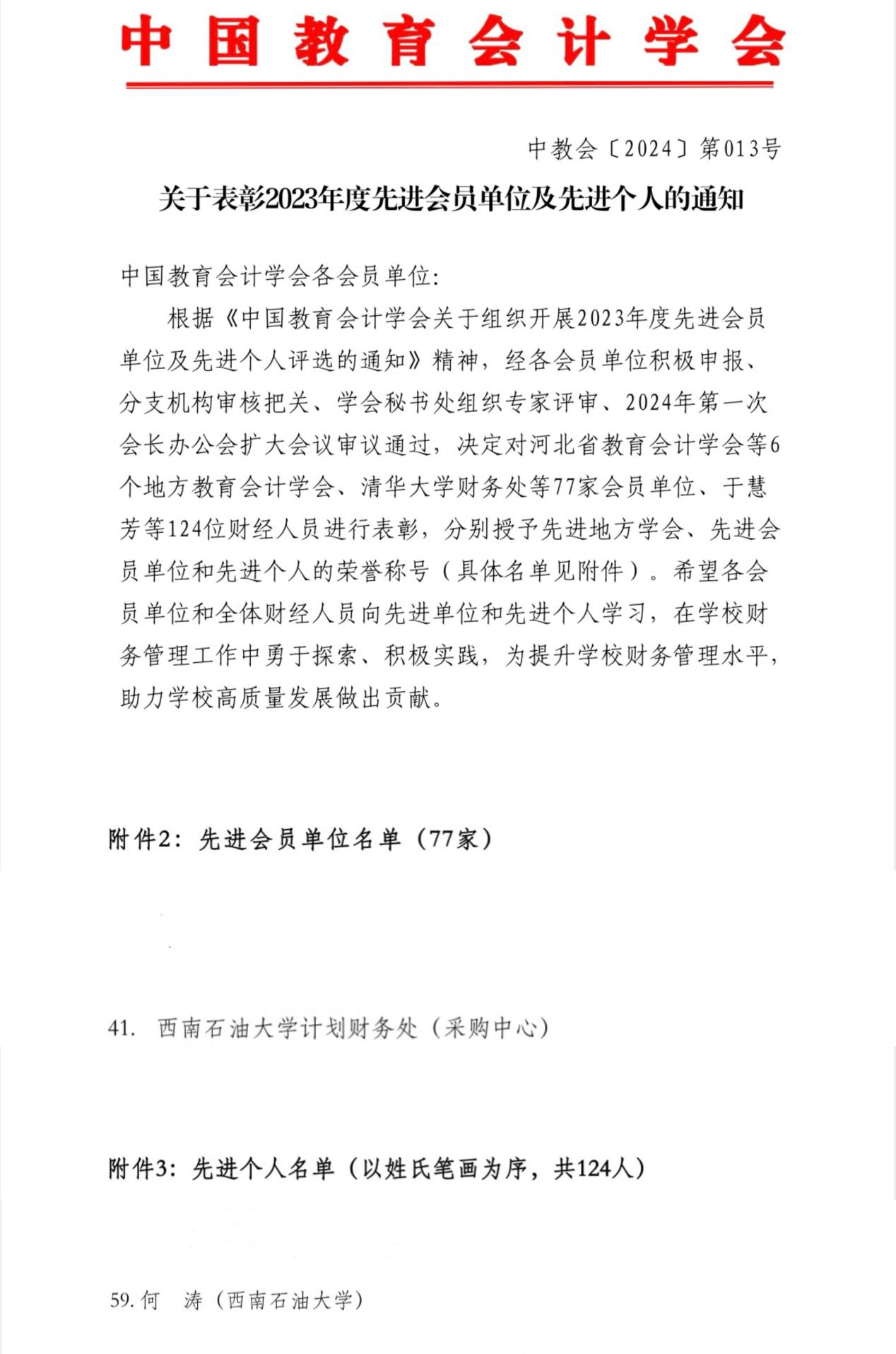 4月19日,中國教育會計學(xué)會發(fā)布《關(guān)于表彰2023年度先進會員單位及先進個人的通知》。我校計劃財務(wù)處(采購中心)榮獲“先進會員單位”榮譽稱號,何濤同志被授予“先進個人”榮譽稱號。
