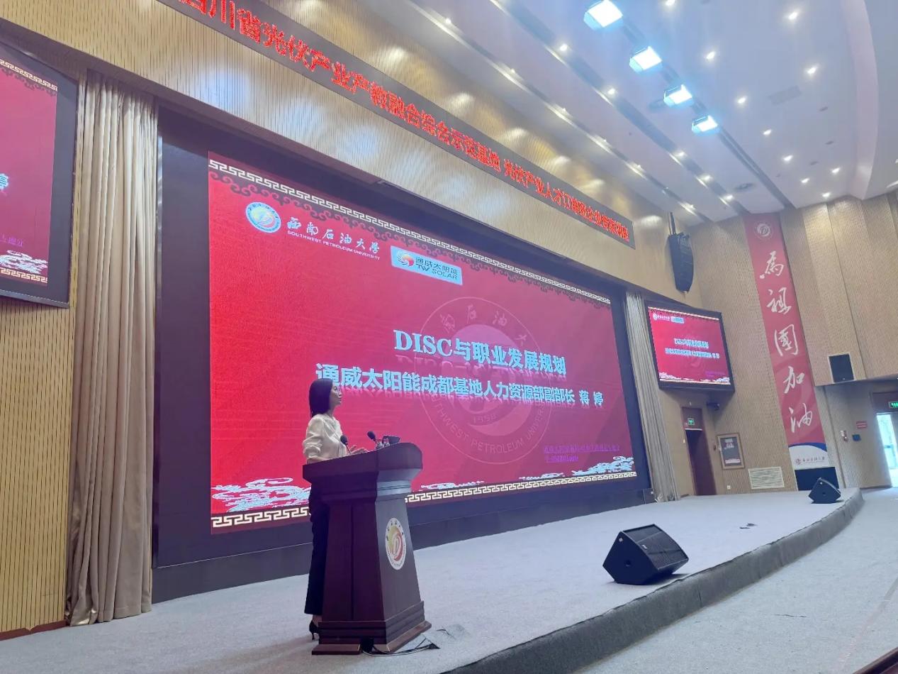 蔣婷介紹了光伏行業的發展趨勢、通威太陽能的人才發展體系和新能源產業鏈布局、希望同學們畢業后積極投身新能源事業,在綠色能源時代發揮自己的聰明才智。