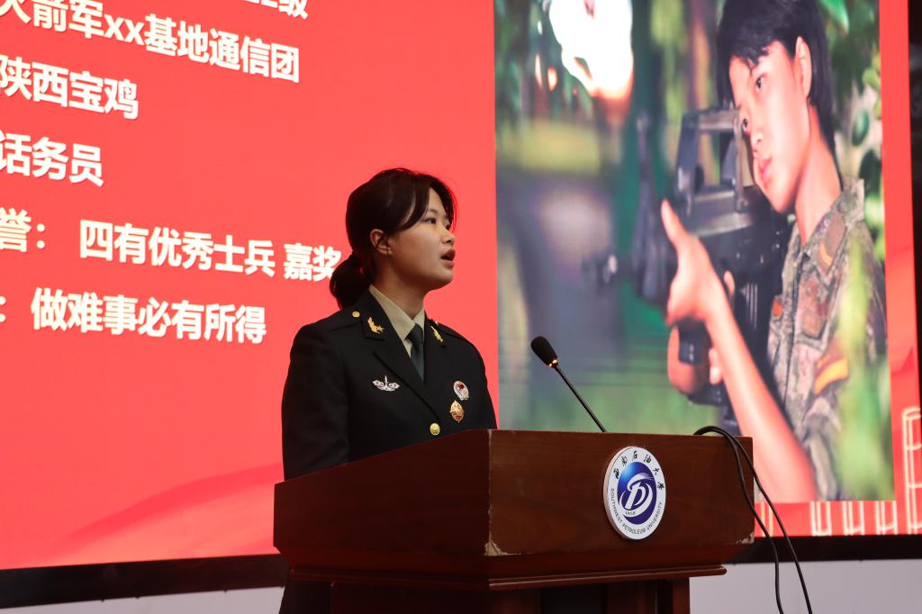 宣講前,南充校區“西柚”老兵隊隊長何蒙介紹了“西柚”老兵隊積極參與各類志愿服務、社會公益活動相關情況,五名分別曾服役于空軍、火箭軍、武警的退役復學大學生代表分享了他們的軍旅生涯和退役復學后的心路歷程,闡述了對“青春獻軍營,退伍不褪色”的理解。趙巍在分享中介紹了“為什么要去參軍入伍”。曾經的新時代話務女兵,現在的“西柚”老兵隊副隊長嚴文芮給自己立下了又一個青春誓言:完成學業后,將“二次入伍”,續寫軍旅榮光。全體隊員現場齊唱歌曲《祖國不會忘記》。
