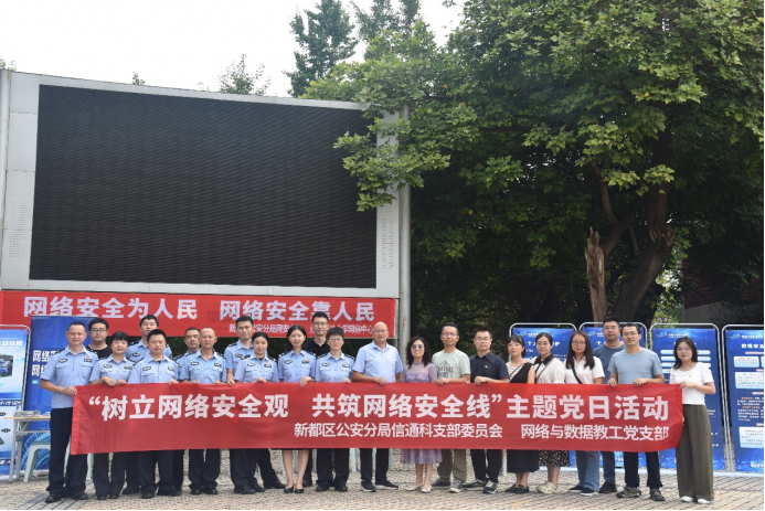 9月9日至15日,是2024年國家網(wǎng)絡(luò)安全宣傳周。為進一步提高全民網(wǎng)絡(luò)安全意識,引導(dǎo)廣大師生增強網(wǎng)絡(luò)安全防范意識和自我保護能力,9月13日上午,網(wǎng)信中心網(wǎng)絡(luò)與數(shù)據(jù)教工黨支部聯(lián)合新都區(qū)公安分局信通科黨支部在學(xué)校博學(xué)樓廣場開展了“樹立網(wǎng)絡(luò)安全觀 共筑網(wǎng)絡(luò)安全線”主題黨日活動。