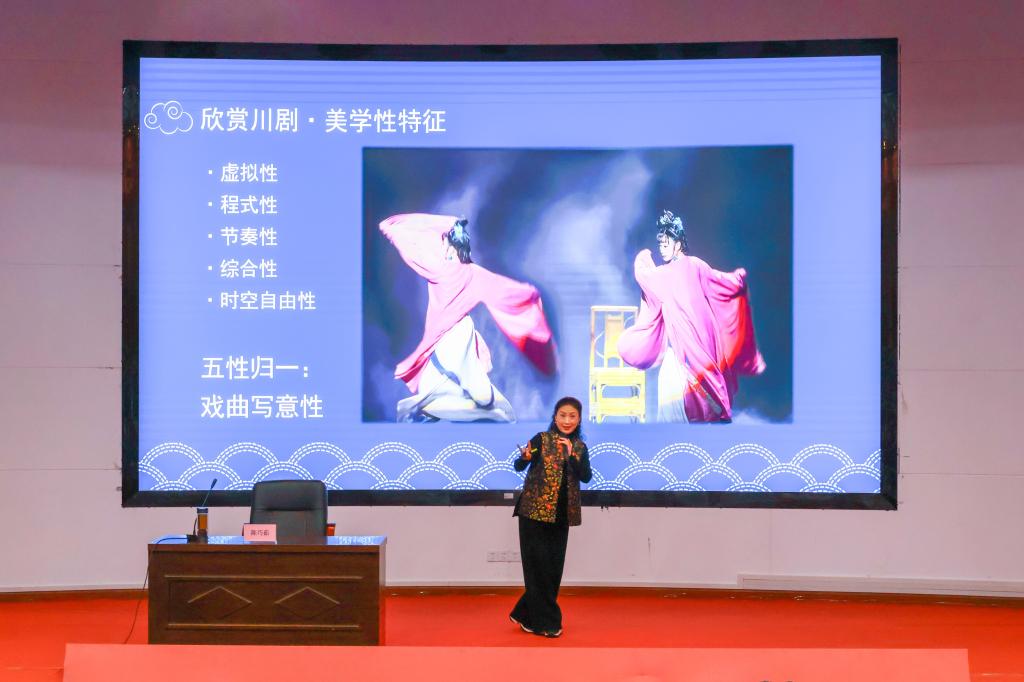 作為國家級非物質文化遺產川劇代表性傳承人,陳巧茹結合珍貴的圖片、視頻資料等,從自己的個人經歷出發,講述了川劇在新時代蓬勃發展的歷程。她不僅分享了自己對川劇藝術的獨到見解,還通過生動的表演示范,讓同學們深刻體會到川劇表演的獨特魅力和藝術價值。她介紹道,川劇是中華梨園中的璀璨明珠,擁有悠久的歷史和豐富的藝術表現形式。經過三百多年的發展和演變,川劇尤以劇本文辭優美、表演豐富而著稱。川劇融合了高腔、昆曲、胡琴、彈戲和燈戲五種聲腔,尤其擅長三?。ㄐ∩⑿〉?、小丑)的表演,積累了眾多獨特的表演程式,這些都充分體現了中國戲曲的美學特色。隨著時代的發展,川劇也在不斷創新,吸收現代元素,以適應現代觀眾的審美需求,使這一古老藝術形式煥發出新的生命力。