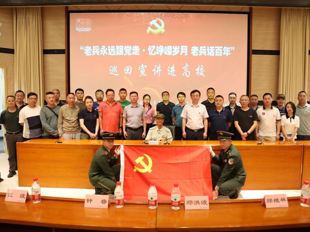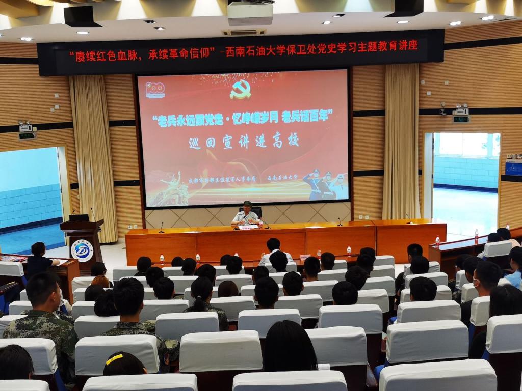 為學習革命前輩英雄事跡,弘揚初心為民、衷心向黨的革命精神,深入推動黨史學習教育,6月3日下午,校保衛處聯合新都區退役軍人事務局在思學樓A114會議室舉行“老兵永遠跟黨走?憶崢嶸歲月 老兵話百年”巡回宣講報告會暨“賡續紅色血脈,承繼革命信仰”西南石油大學保衛處黨史學習教育講座??姑涝蠎鹗俊⒁患墏麣堒娙?、全國模范退役軍人涂伯毅作主題報告。校保衛處處長鄧洪波、副處長江波,區退役軍人事務局雙擁優待科科長邱繼林,保衛處全體黨員以及校民兵預備役、大學征兵志愿服務大隊等學生組織骨干參加報告會。會議由區退役軍人事務局副局長鐘睿主持。