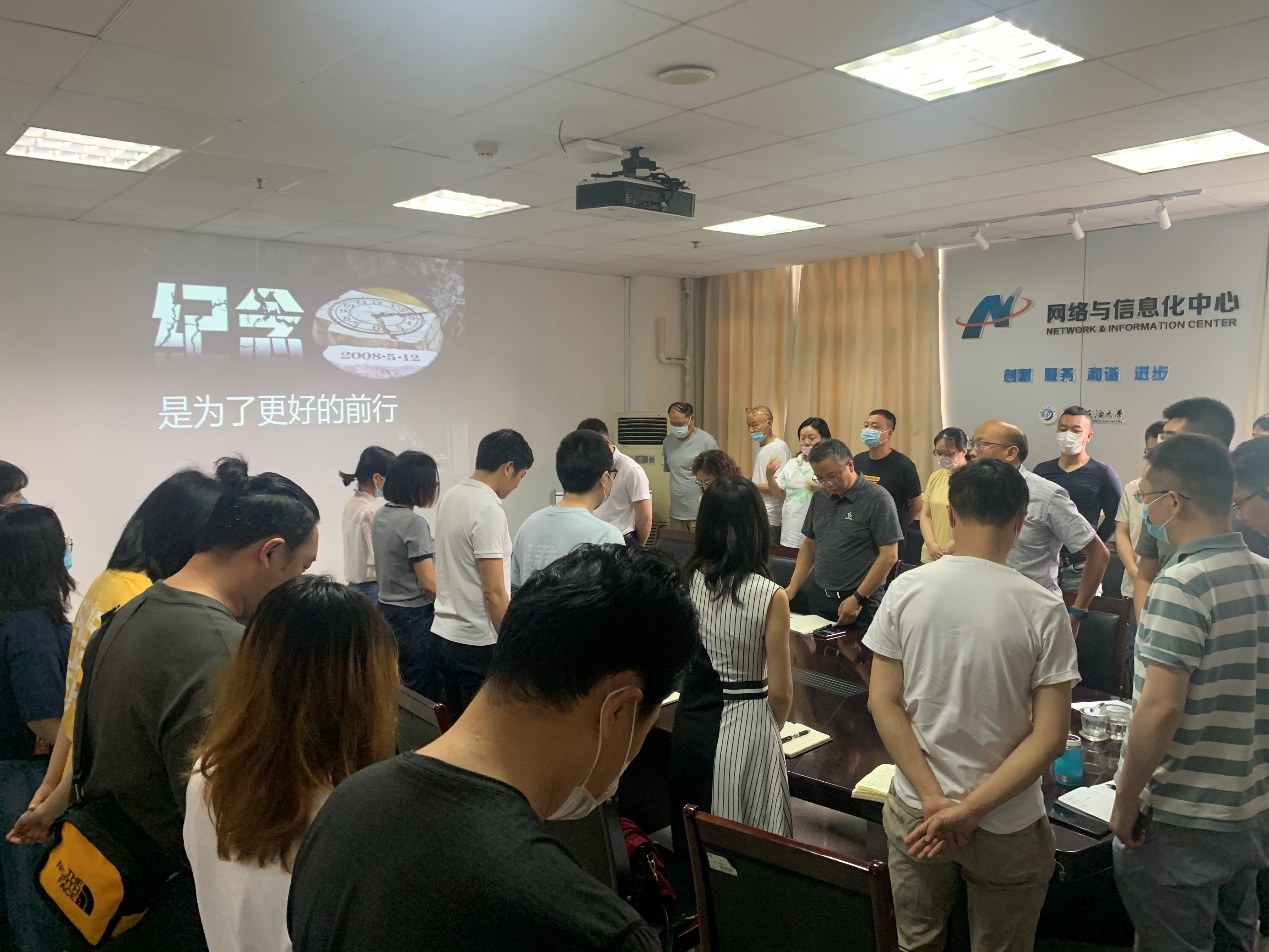 “請全體起立,默哀三分鐘”全體參會人員集體肅立,向在5.12地震中犧牲的烈士和遇難的同胞表示深切哀悼。
