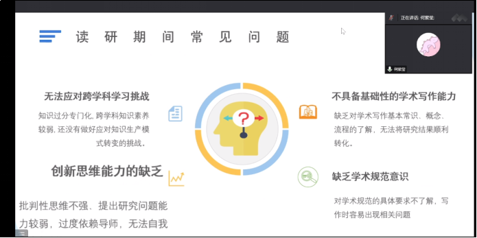 何縈瑩在《如何使研究生養成良好的“研究”習慣》報告從研究生應具備的研究能力、研究生讀研期間的常見問題、導師指導研究生養成良好研究習慣的方法三個方面進行闡述和講解,進一步提升了我們的信息素養和科研素養,進一步打造強大的科研團隊知識庫,為我們建立創新型科研團隊提供了思路和方法。