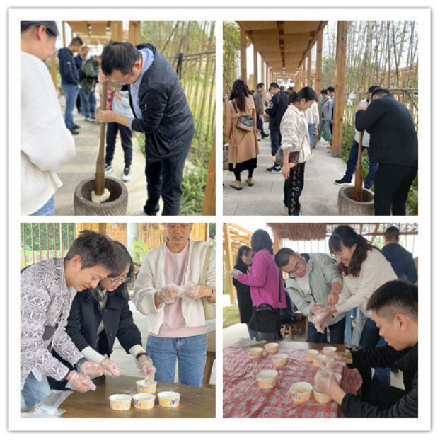 經過近一個小時的車程,中心一行到達了目的地。工作人員為職工們精心準備了體驗傳統美食制作活動——打糍粑?;顒娱_始前,全體職工分為五個小組,工作人員介紹道:“打糍粑非??简瀳F隊成員的默契,用力不夠或用力不均勻,打的糍粑團中就可能夾雜著米粒,影響糍粑的美觀和口感……”隨后,工人將蒸熟后的糯米倒入槽中,大家拿著一根杵杖,你杵一棍,我掄一杵,干得熱火朝天,不一會兒,糯米全部粘成一團。各組將打好的糯米團分成糍粑塊,再裹上紅糖,熱乎、綿軟,軟糯中帶著香甜?!靶r候看過家人打糍粑,沒想到在這里還能親身體驗,簡直太棒了?!币幻下毠榇螋亵位顒咏泻谩?/p>