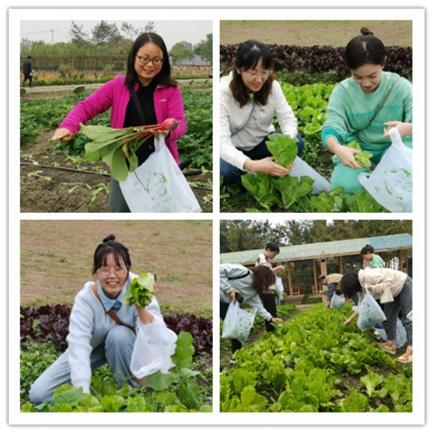 大家興奮地采摘著蔬菜,雙手沾滿了泥土依然絲毫不減勞動熱情,享受著豐收帶來的喜悅。不一會兒工夫,小白菜、生菜、羽衣甘藍、萵筍等各類蔬菜已經裝滿了袋子。