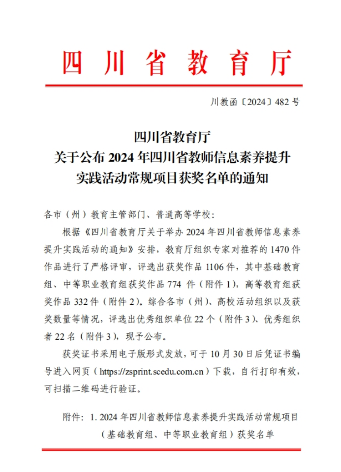 近日,四川省教育廳公布“2024年四川省教師信息素養提升實踐活動”常規項目獲獎名單。我校在此次活動中喜獲佳績,表現突出。