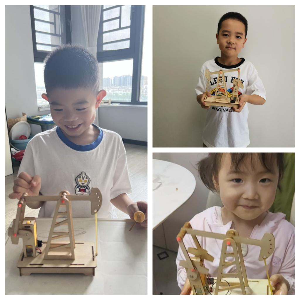 在動手實踐環節,家長陪同孩子一起通過組裝簡易磕頭機模型,學習機械傳動原理。模型采用編號零件包拼接,通過橡皮筋纏繞方向調節曲軸運動,旋轉手柄可觀察“驢頭”擺動頻率與平衡配重的關系。孩子們在實踐中不僅掌握了石油開采的基礎原理,更在調試模型的過程中培養了問題解決能力。