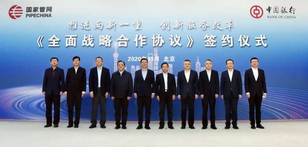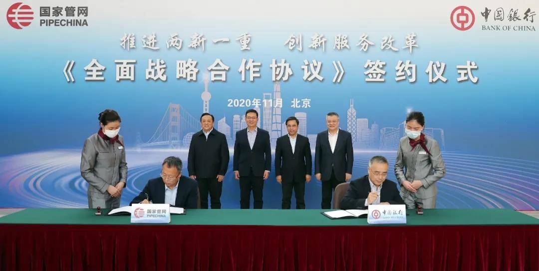 11月26日,國家管網集團與中國銀行以“推進兩新一重·創新服務改革”為主旨簽訂《全面戰略合作協議》。國家管網集團董事長、黨組書記張偉,總經理、黨組副書記侯啟軍,中國銀行董事長、黨委書記劉連舸,行長、黨委副書記王江出席儀式。國家管網集團總會計師、黨組成員王德華,中國銀行副行長、黨委委員王緯代表雙方簽約。